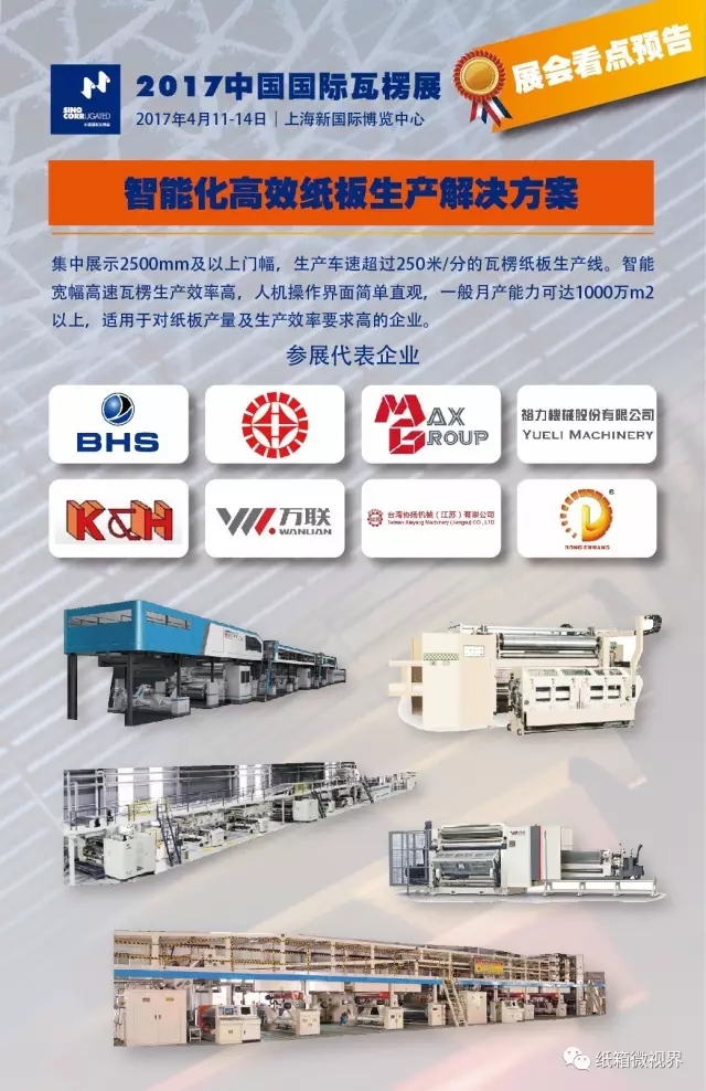 1、纸袋封口机——bag sealing machine 2、纸袋纸——kraft sack paper 3、纸堆高度检验器——pile height detector 4、纸堆给纸器——pile feeder 5、纸堆升降装置——pile height regulator 6、纸垛——paper pile 7、纸幅粘毛(纸病)——felt pick 8、纸管用纸板——core board 9、纸和纸板厚度——thickness of paper and corrugated board 10、纸和纸板偏斜度——skewness of paper and corrugated board 11、纸和纸板吸水性——water absorbability of paper and corrugated board 12、纸盒冲切折痕机——cutting-creaser 13、纸盒用纸板——box board 14、纸浆厂——pulp mill 15、纸浆纸板——pulpboard 16、纸浆搅拌机——kneading pulper 17、纸浆与造纸工业技术协会——TAPPI 18、纸浆造纸工业——pulp and paper industry 19、纸卷——batch roll 20、纸卷库存——roll stock 2017中国国际瓦楞展、2017中国国际彩盒展和2017中国包装容器展,三展同期,一次观展,四大收获 看瓦楞展:纵览全球瓦楞设备与耗材知名供应商品牌、前沿技术及高性价比设备 看彩盒展:发现彩盒行业新的利润增长点,以协同效应助力企业拓展新业务领域 看包装容器:观摩容器展上展示的上万种包装制品的创新设计和全新工艺 见包装用户:直面容器展上众多来自包装用户的包装研发及采购决策者,拓人脉谈订单